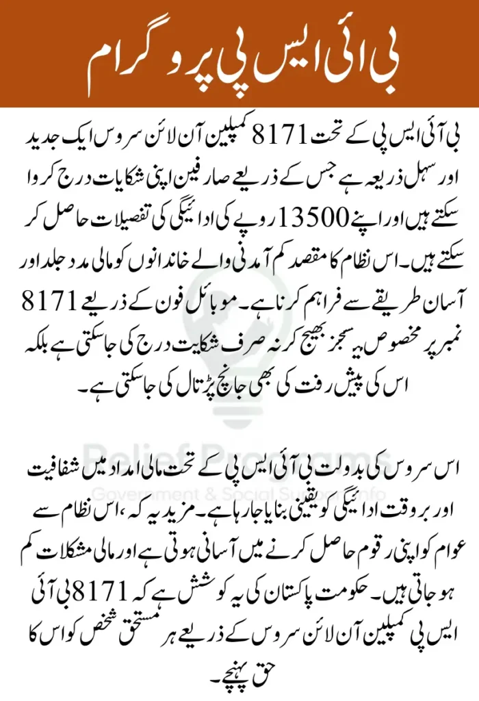 بی آئی ایس پی نے 8171 نمبر کے ذریعے شکایات کا نظام بنایا ہے تاکہ لوگوں کو اپنے حقوق کی حفاظت میں آسانی ہو۔ اس کے ذریعے غلط معلومات، ادائیگی میں تاخیر، یا دیگر مسائل جلد حل کیے جا سکتے ہیں۔ اس سروس کی بدولت لاکھوں خاندان اپنی مالی حالت بہتر بنانے میں کامیاب ہو رہے ہیں اور یہ نظام مزید بہتر بنانے کے لیے مستقل کام جاری ہے۔