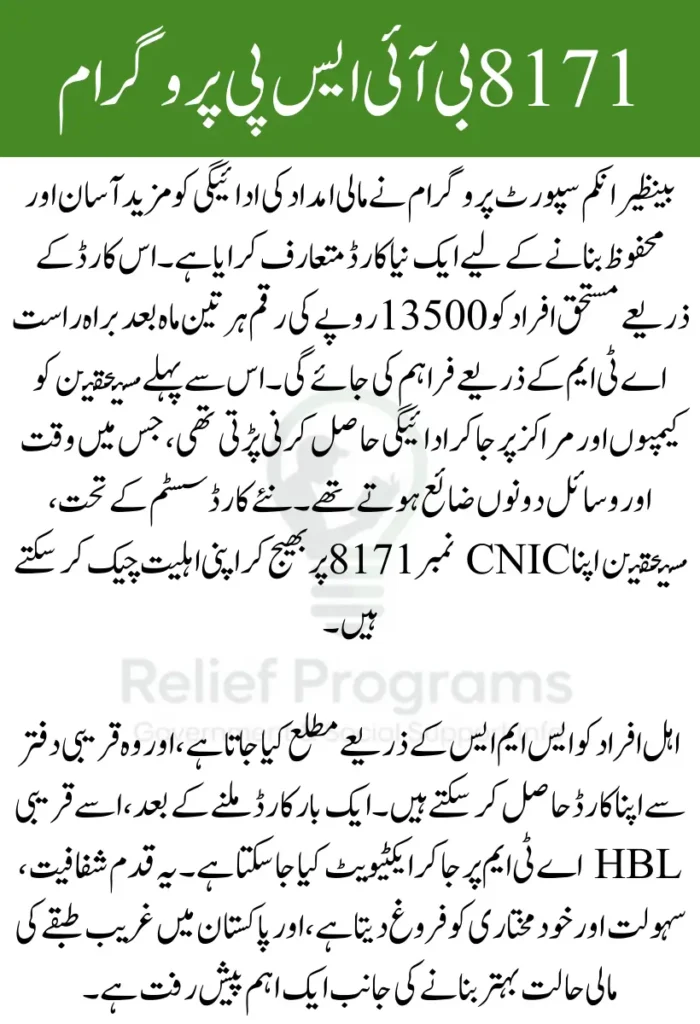 کارڈ کے ذریعے 13500 روپے ہر تین ماہ بعد فراہم کیے جائیں گے۔ اس کے لیے ضروری ہے کہ آپ پہلے سے رجسٹرڈ ہوں اور آپ کی معلومات نادرا کے ساتھ درست ہوں۔ اگر آپ نے اپنا CNIC نمبر 8171 پر بھیجا ہے اور آپ اہل ہیں تو آپ کو جلد ہی مطلع کیا جائے گا۔