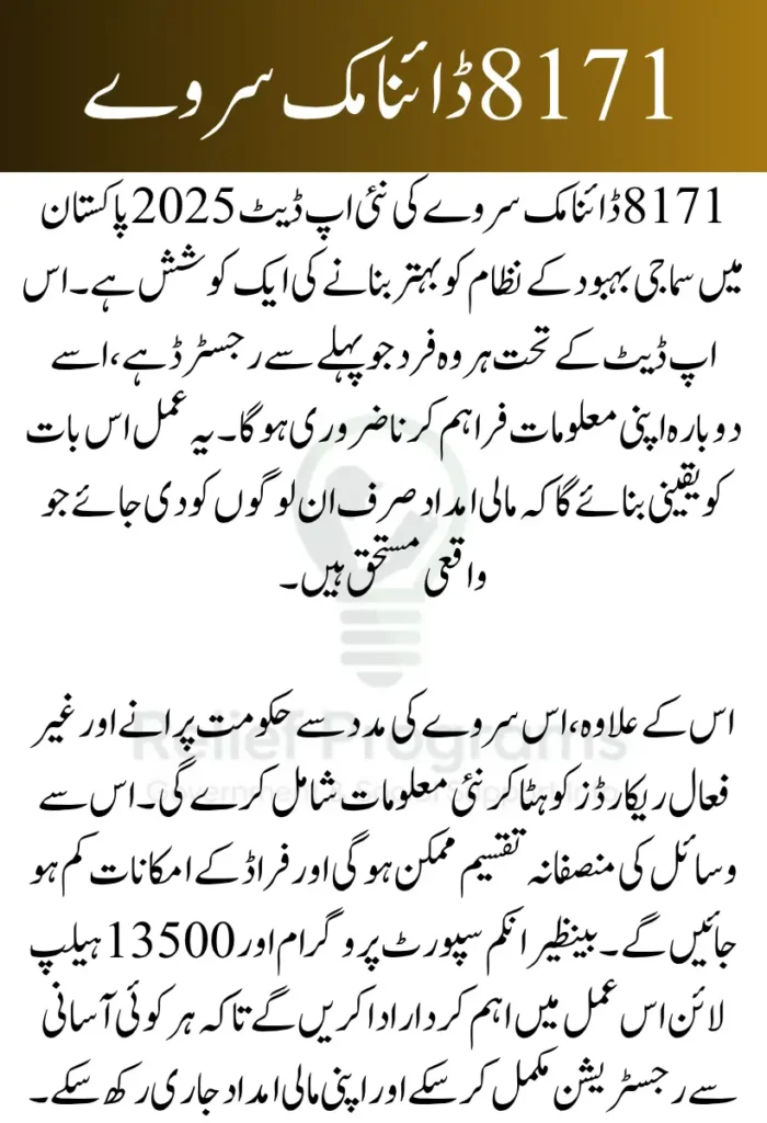The 2025 re-registration requirement under the 8171 Dynamic Survey is a critical step toward improving Pakistan’s social welfare system. By confirming eligibility and updating records, the government can better serve vulnerable populations with targeted financial aid. Beneficiaries should prioritize completing this re-registration to continue receiving support without interruption.