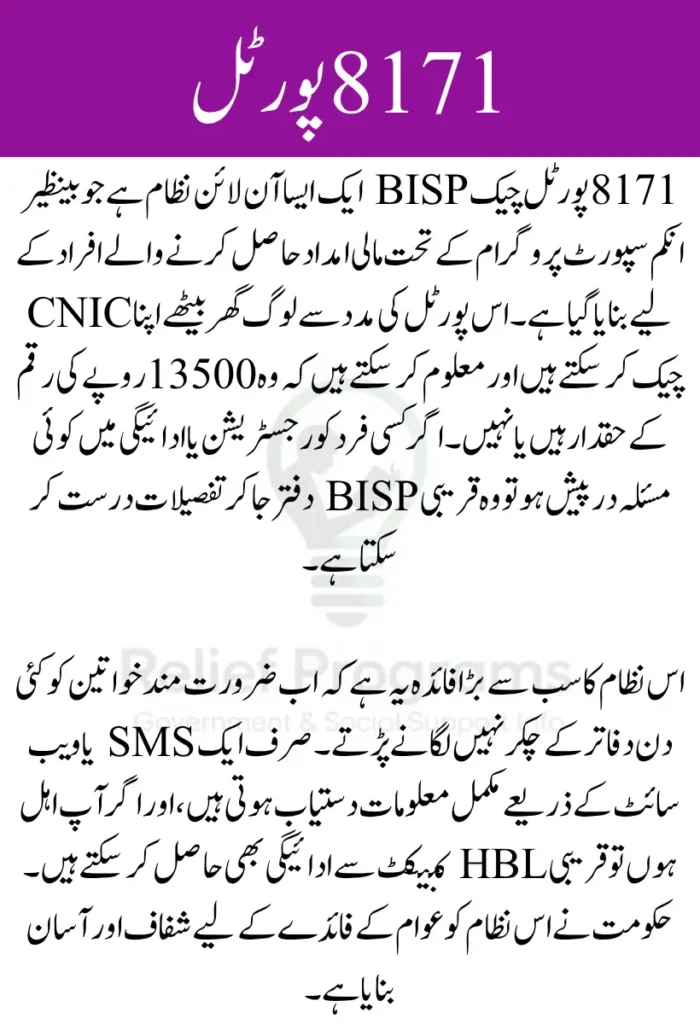 8171 پورٹل کے ذریعے اب آپ آسانی سے اپنا CNIC نمبر چیک کر سکتے ہیں کہ آپ بینظیر انکم سپورٹ پروگرام میں شامل ہیں یا نہیں۔ یہ نظام خاص طور پر ان افراد کے لیے بنایا گیا ہے جو دور دراز علاقوں میں رہتے ہیں اور دفاتر جانے میں مشکل محسوس کرتے ہیں۔ اب صرف ایک SMS یا ویب سائٹ کے ذریعے آپ اپنی مالی معاونت کی مکمل تفصیل جان سکتے ہیں۔