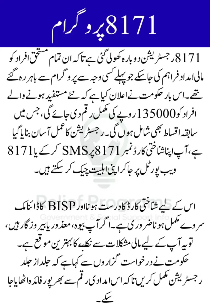 8171 رجسٹریشن ایک بار پھر کھول دی گئی ہے تاکہ وہ خاندان جو اب تک اس امدادی پروگرام سے فائدہ نہیں اٹھا سکے، اب رجسٹر ہو کر مکمل 135000 روپے حاصل کر سکیں۔ یہ ایک بہترین موقع ہے اُن لوگوں کے لیے جو غربت اور مہنگائی کے باعث مشکلات کا شکار ہیں۔ اس بار حکومت نے پرانے بقایاجات بھی شامل کر دیے ہیں تاکہ ایک بڑی رقم یکمشت فراہم کی جا سکے۔