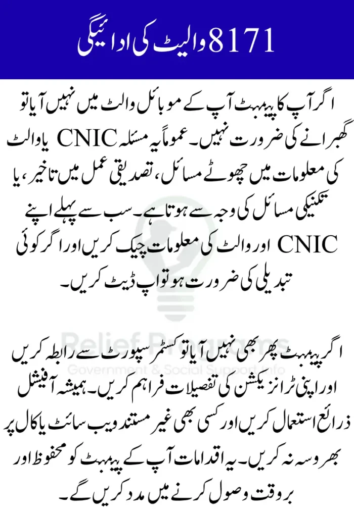 | Payment not appearing | CNIC or wallet mismatch | Update details and verify CNIC |