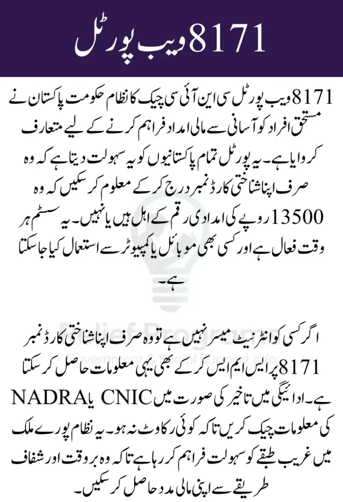 8171 ویب پورٹل سی این آئی سی چیک ایک آسان طریقہ ہے جس کے ذریعے آپ گھر بیٹھے اپنی مالی امداد کے لیے اہلیت معلوم کر سکتے ہیں۔ صرف شناختی کارڈ نمبر درج کرنے سے آپ جان سکتے ہیں کہ آپ بی آئی ایس پی کی 13500 روپے کی قسط کے مستحق ہیں یا نہیں۔