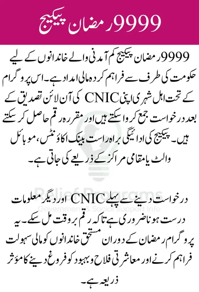 The 9999 Ramzan Package is a government financial assistance initiative aimed at helping low-income families during the holy month of Ramadan. Eligible citizens can verify their CNIC online, register for the program, and receive funds directly through secure channels.