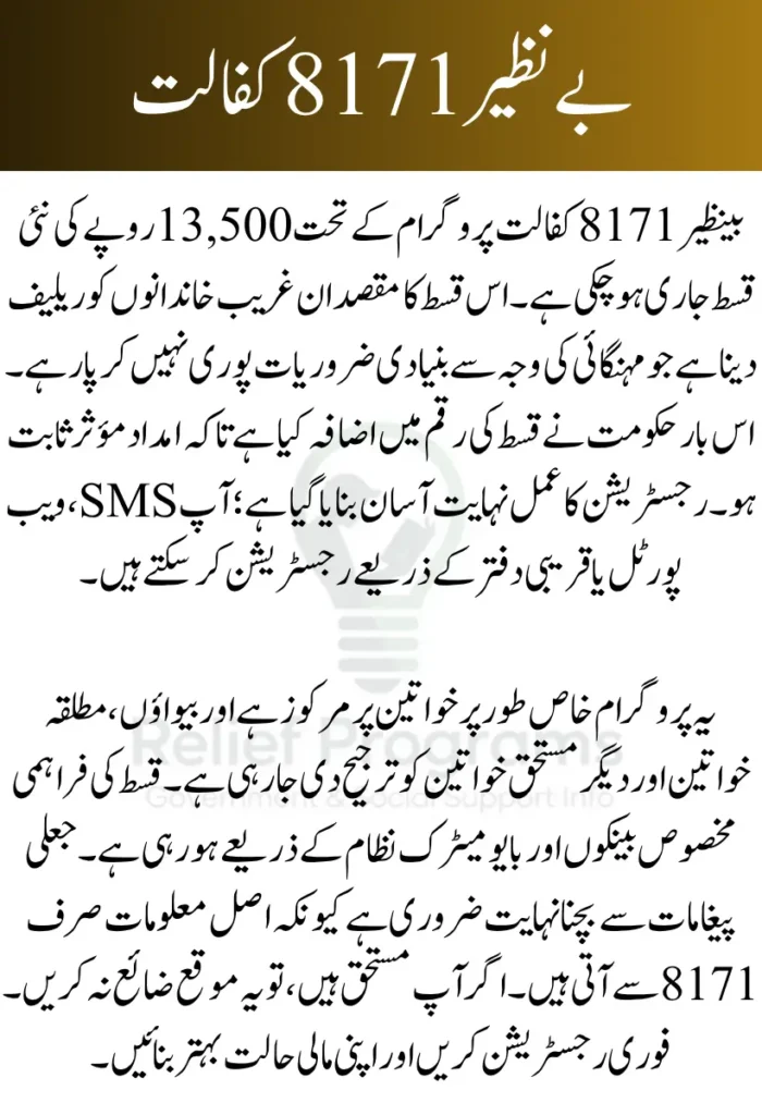 بینظیر 8171 کفالت پروگرام کے تحت نئی قسط 13,500 روپے کی جاری ہو چکی ہے۔ یہ قسط ایسے خاندانوں کے لیے ہے جو مہنگائی کے باعث شدید مالی مشکلات کا سامنا کر رہے ہیں۔ حکومت کا مقصد ہے کہ زیادہ سے زیادہ مستحق افراد کو فوری ریلیف فراہم کیا جائے تاکہ وہ اپنی روزمرہ ضروریات پوری کر سکیں۔