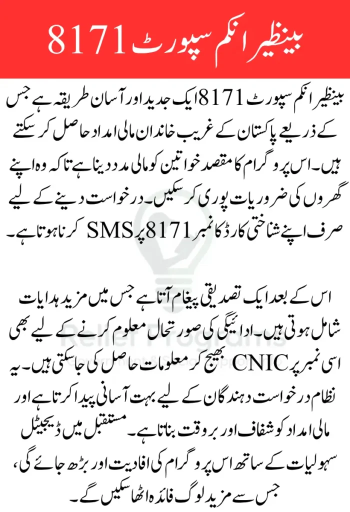 بینظیر انکم سپورٹ 8171 پاکستان کے غریب خاندانوں کے لیے مالی مدد حاصل کرنے کا آسان ذریعہ ہے۔ اس کے ذریعے لوگ اپنے شناختی کارڈ کا نمبر SMS کر کے فوری طور پر درخواست دے سکتے ہیں اور اپنے ادائیگیوں کی صورتحال معلوم کر سکتے ہیں۔ خواتین کو مالی امداد براہ راست دی جاتی ہے تاکہ خاندانوں کی زندگی بہتر بن سکے۔