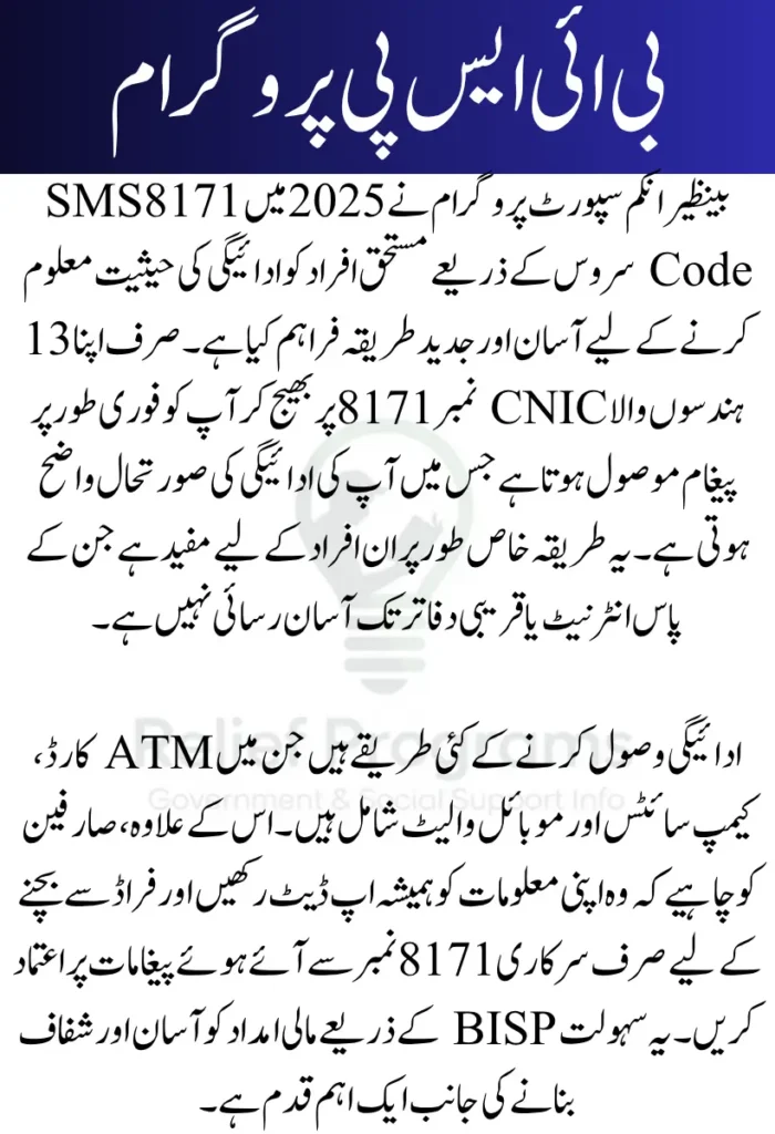 Visit the 8171 web portal or send your CNIC (without dashes) via SMS to 8171 to receive your payment schedule.