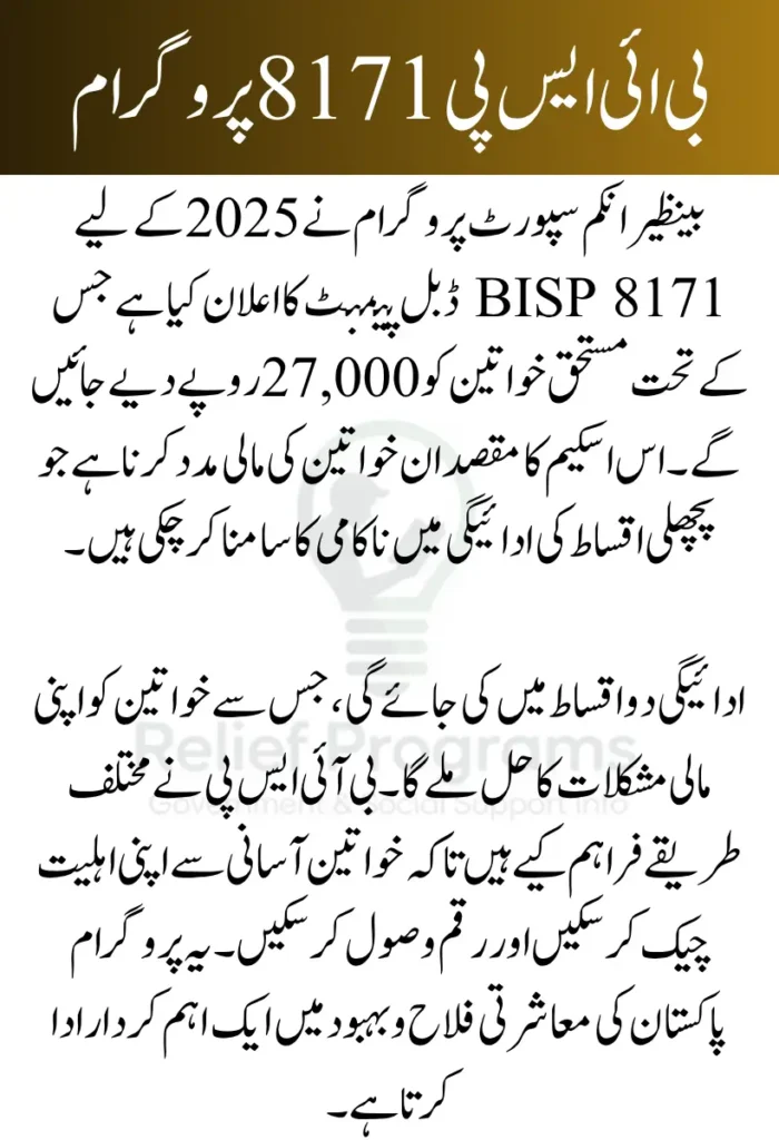 The BISP 8171 Double Payment update of Rs. 27,000 is a significant step toward supporting vulnerable women and families in Pakistan. By understanding the eligibility rules and following the correct procedures for verification and collection, beneficiaries can secure this much-needed financial support. Staying proactive and informed will help recipients fully benefit from this program and improve their financial wellbeing.