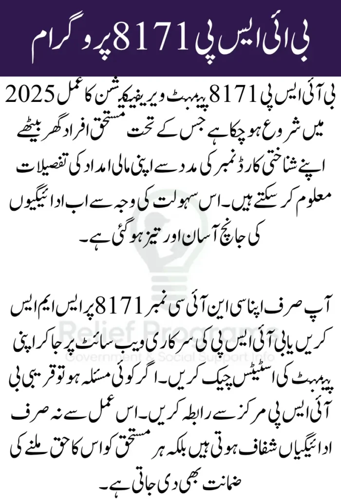 بی آئی ایس پی پروگرام کا مقصد غربت میں کمی لانا اور کمزور طبقے کی مدد کرنا ہے۔ 8171 کے ذریعے دی جانے والی پیمنٹس سے ہزاروں خاندانوں کو روزمرہ کی ضروریات پوری کرنے میں مدد ملتی ہے۔ گھر بیٹھے پیمنٹ کی تصدیق کے آسان طریقے نے اس پروگرام کی افادیت میں اضافہ کیا ہے۔