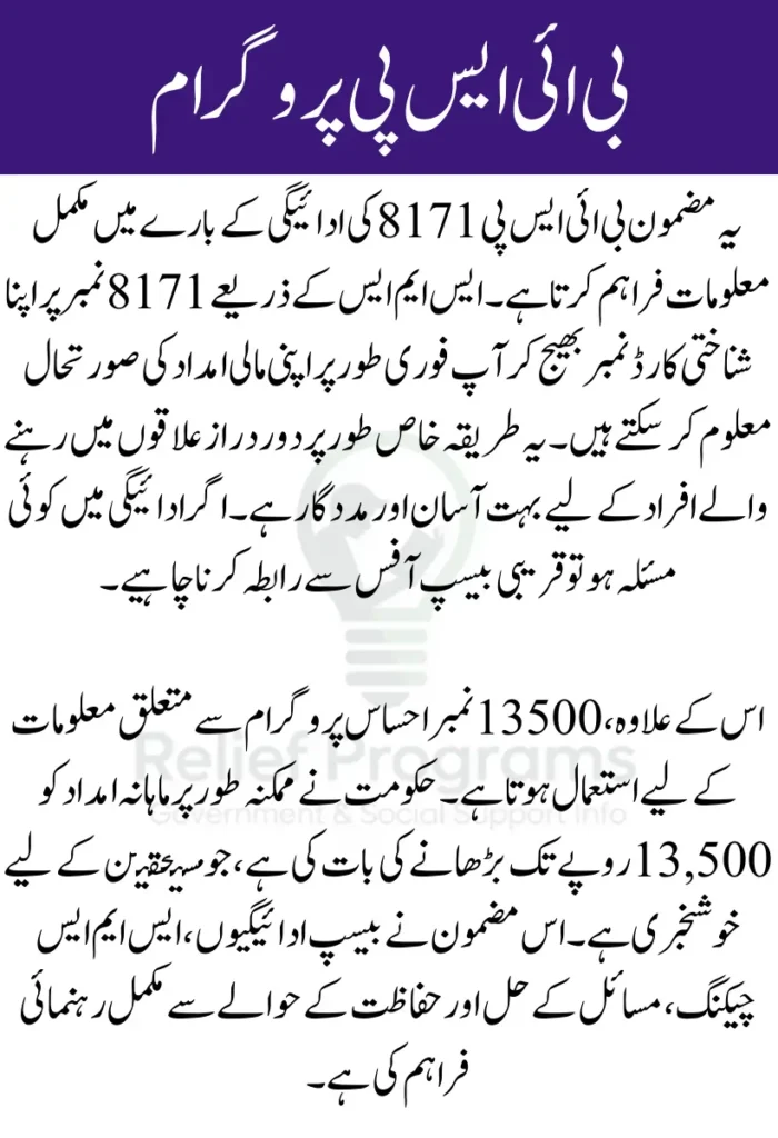 اپنے شناختی کارڈ کا نمبر بغیر ہائفن کے 8171 پر ایس ایم ایس کر کے آپ فوری طور پر اپنی ادائیگی کی صورتحال معلوم کر سکتے ہیں۔ اگر آپ کو ادائیگی میں کوئی مسئلہ یا تاخیر ہو تو قریبی بیسپ آفس جا کر وضاحت حاصل کرنی چاہیے۔ اس طرح آپ اپنی مالی مدد کو برقرار رکھ سکتے ہیں اور کسی پریشانی سے بچ سکتے ہیں۔ بیسپ کے ایس ایم ایس سسٹم نے بہت سے لوگوں کی زندگی آسان کر دی ہے۔