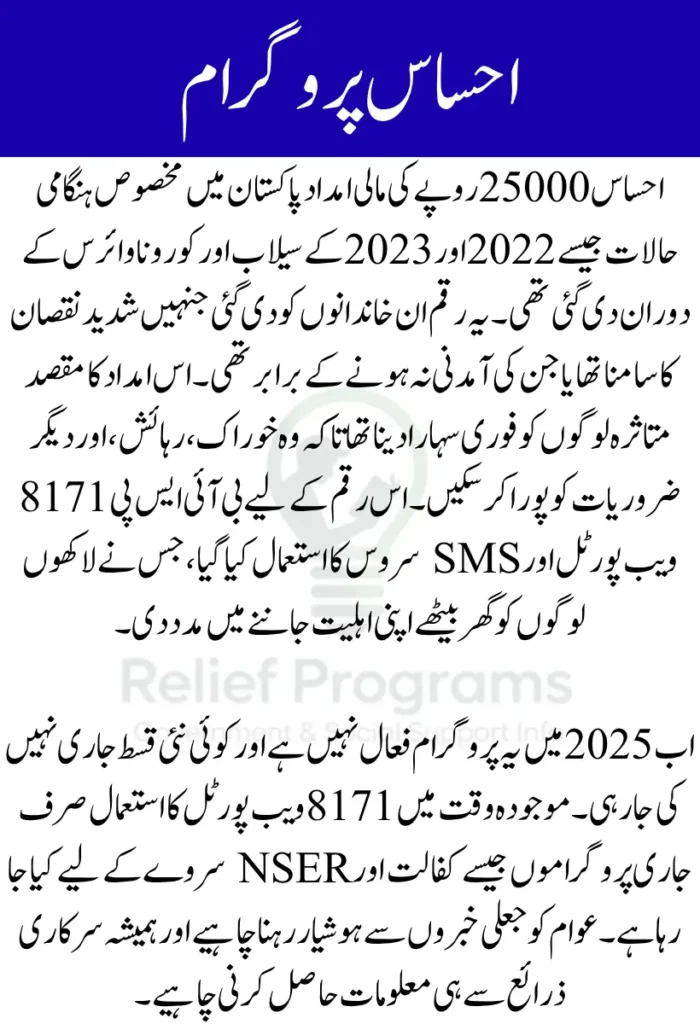 احساس 25000 روپے کی امدادی رقم اب فعال نہیں ہے، لیکن یہ ماضی میں قدرتی آفات جیسے سیلاب اور کورونا وائرس کے دوران دی گئی تھی۔ اس رقم کا مقصد متاثرہ خاندانوں کو فوری مالی مدد فراہم کرنا تھا تاکہ وہ اپنی بنیادی ضروریات پوری کر سکیں۔