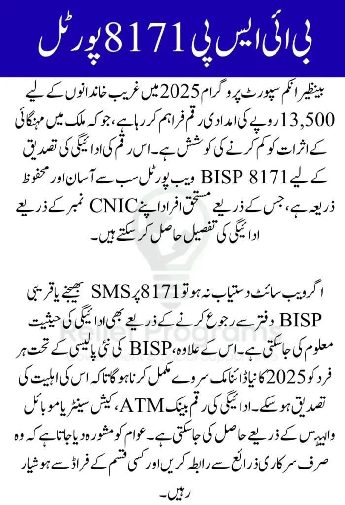 بینظیر انکم سپورٹ پروگرام میں بھی پاکستان کے غریب اور مستحق خاندانوں کے لیے امید کی کرن ہے۔ حکومت نے اس سال ادائیگی کی رقم بڑھا کر 13,500 روپے کر دی ہے تاکہ عوام کو مہنگائی میں ریلیف دیا جا سکے۔ مستفید ہونے والوں کو اپنی ادائیگی کی حیثیت جاننے کے لیے BISP 8171 ویب پورٹل کا استعمال کرنا ضروری ہے، جسے موبائل اور کمپیوٹر دونوں پر استعمال کیا جا سکتا ہے۔