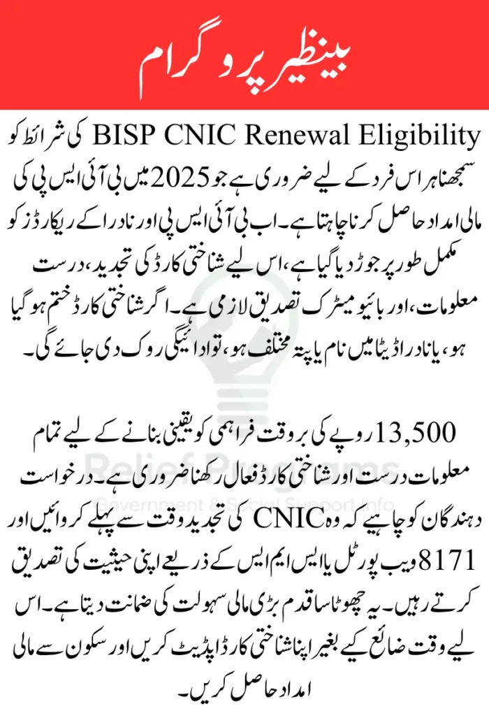 BISP CNIC Renewal Eligibility is now a critical requirement for all beneficiaries who wish to continue receiving financial support under the Benazir Income Support Programme in 2025. If your CNIC is expired, incorrect, or not updated in the NADRA system, your Rs. 13,500 quarterly payment could be delayed or even blocked. With tighter data checks and real-time integration between BISP and NADRA, staying eligible now depends on more than just past registration.