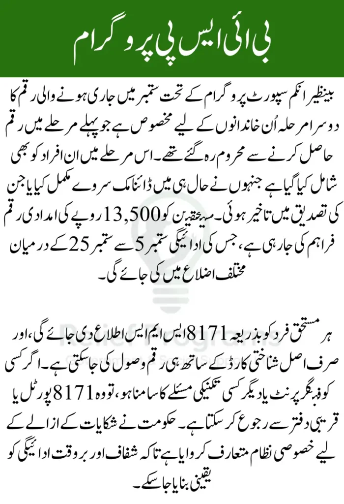 بینظیر انکم سپورٹ پروگرام کے تحت ستمبر میں امدادی رقم کی تقسیم کا دوسرا مرحلہ جاری ہے۔ اس مرحلے میں اُن افراد کو شامل کیا گیا ہے جن کی تصدیق حالیہ ہفتوں میں مکمل ہوئی یا جو کسی وجہ سے پچھلے مرحلے میں رقم حاصل نہ کر سکے۔ مستحقین کو بذریعہ 8171 ایس ایم ایس اطلاع دی جا رہی ہے، جس کے بعد وہ مقررہ مرکز سے اپنی رقم وصول کر سکتے ہیں۔