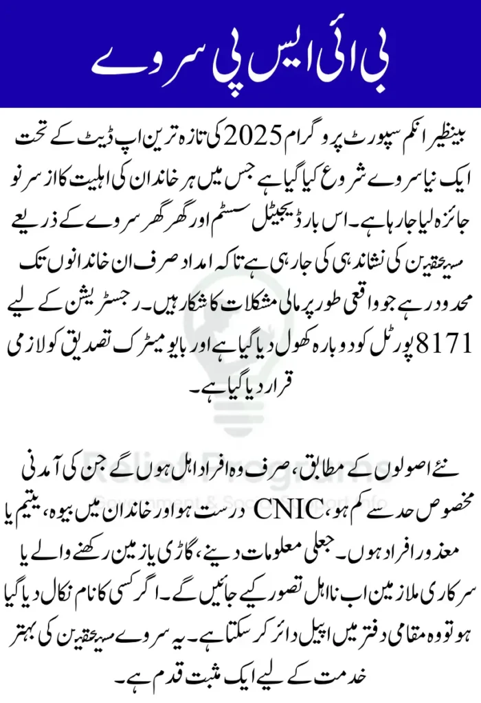 8171 پورٹل کو دوبارہ کھول دیا گیا ہے تاکہ نئے اور پرانے درخواست گزار اپنی معلومات درج یا اپڈیٹ کر سکیں۔ اگر آپ کی آمدنی مخصوص حد سے کم ہے، CNIC درست ہے اور خاندان میں بیوہ یا معذور افراد ہیں تو آپ کی درخواست کو ترجیح دی جائے گی۔ بایومیٹرک تصدیق بھی لازمی قرار دی گئی ہے۔