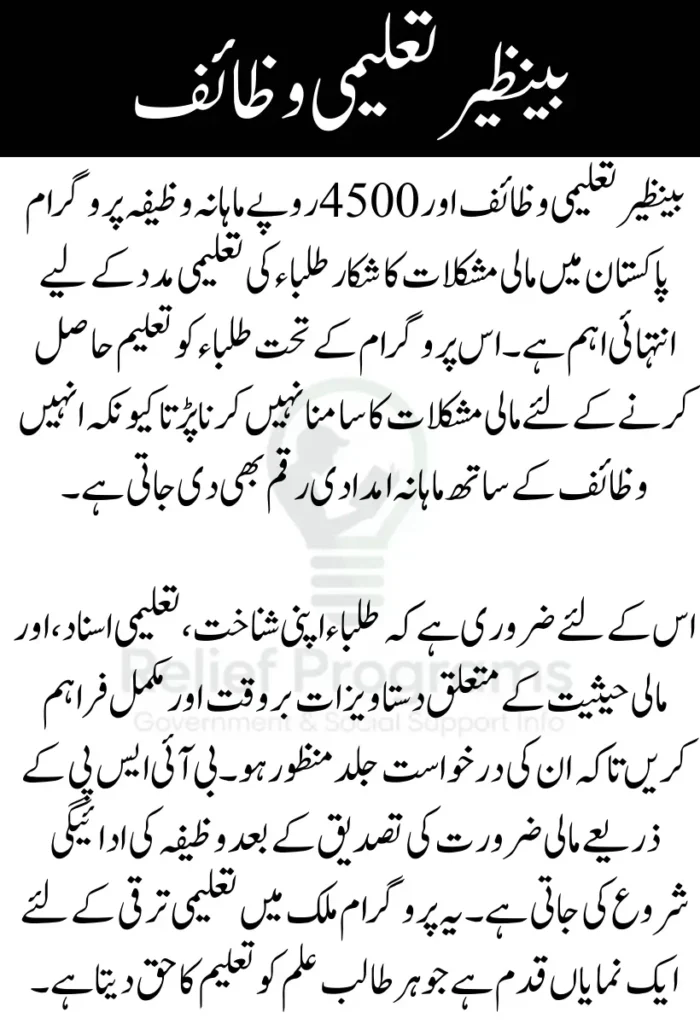 بینظیر تعلیمی وظائف کا مقصد مالی طور پر کمزور طلباء کو تعلیم کے شعبے میں مدد فراہم کرنا ہے۔ یہ وظائف نہ صرف تعلیمی اخراجات کو پورا کرنے میں معاون ہوتے ہیں بلکہ 4500 روپے ماہانہ وظیفہ بھی دیتے ہیں جو طلباء کی روزمرہ ضروریات کو پورا کرنے میں مددگار ثابت ہوتا ہے۔ اس پروگرام کے تحت بچوں کو تعلیم سے محروم نہیں رکھا جاتا۔