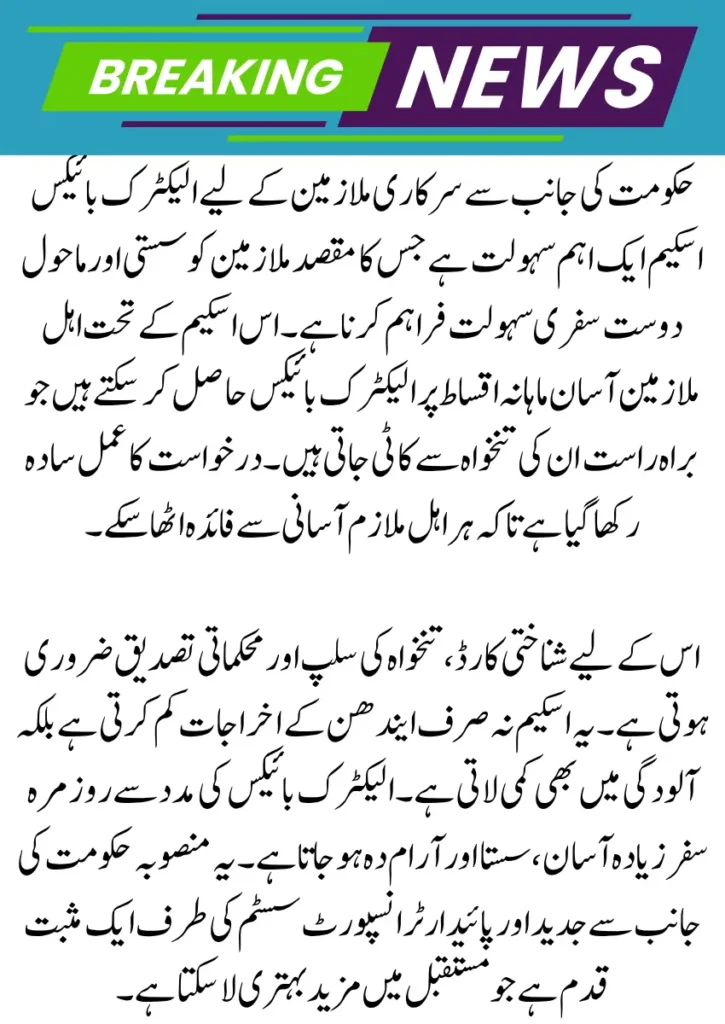 Under this scheme, eligible government staff can apply for electric bikes through their departments and repay the amount in small monthly deductions from their salaries. This article explains how the scheme works, who can apply, what documents are required, and how the installment system is structured in a simple and practical way.