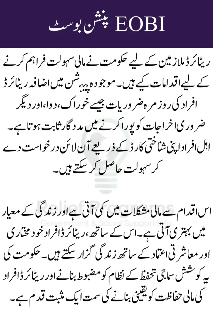 | Eligibility | Registered EOBI contributors, 60+ years old |
