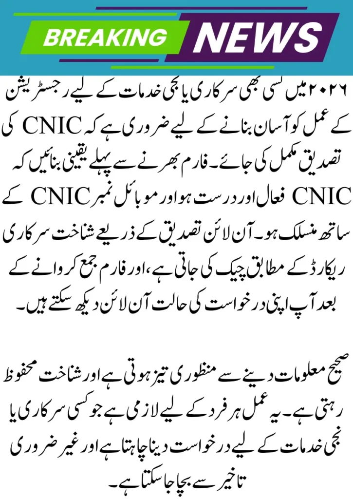 | CNIC Verification | Verify CNIC online via SMS | Ensure digits match exactly |