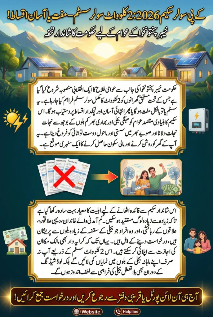 The KP Solar Scheme 2026 is a valuable opportunity for Khyber Pakhtunkhwa residents to access renewable energy without high costs. By offering free or installment-based 2kW solar systems, the program reduces electricity expenses, encourages environmental sustainability, and provides long-term benefits to households. Eligible residents should apply promptly to secure this chance for energy independence and a greener future.