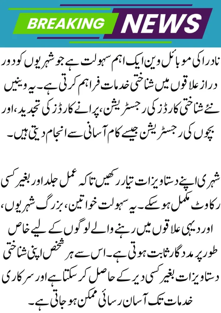 The NADRA Mobile Registration Van Schedule usually follows weekly or monthly routes covering multiple towns. Each stop is often at a school, community center, or easily accessible public area. Citizens are advised to arrive early to ensure they complete their application before the van moves to the next location.