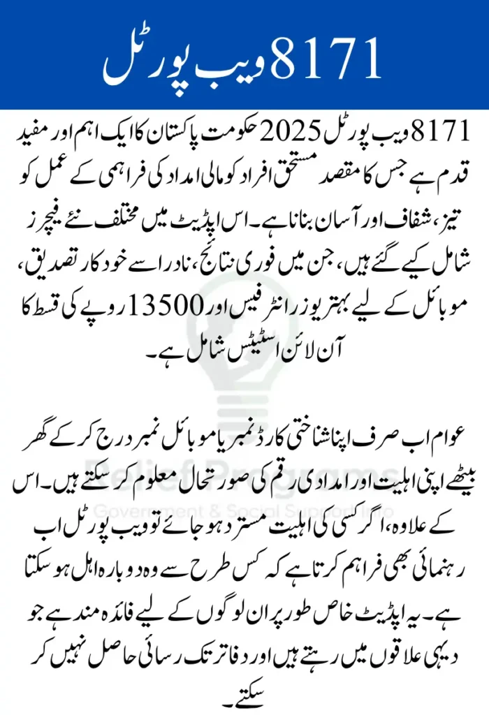 8171 ویب پورٹل کو اس انداز میں اپڈیٹ کیا گیا ہے کہ اب یہ عام لوگوں کے لیے زیادہ آسان اور تیز ہو گیا ہے۔ اس نئے ورژن کی بدولت آپ صرف اپنا شناختی کارڈ نمبر یا موبائل نمبر ڈال کر فوری طور پر اپنی اہلیت معلوم کر سکتے ہیں۔ اس سے نہ صرف وقت کی بچت ہوتی ہے بلکہ بار بار دفاتر کے چکر بھی نہیں لگانے پڑتے۔