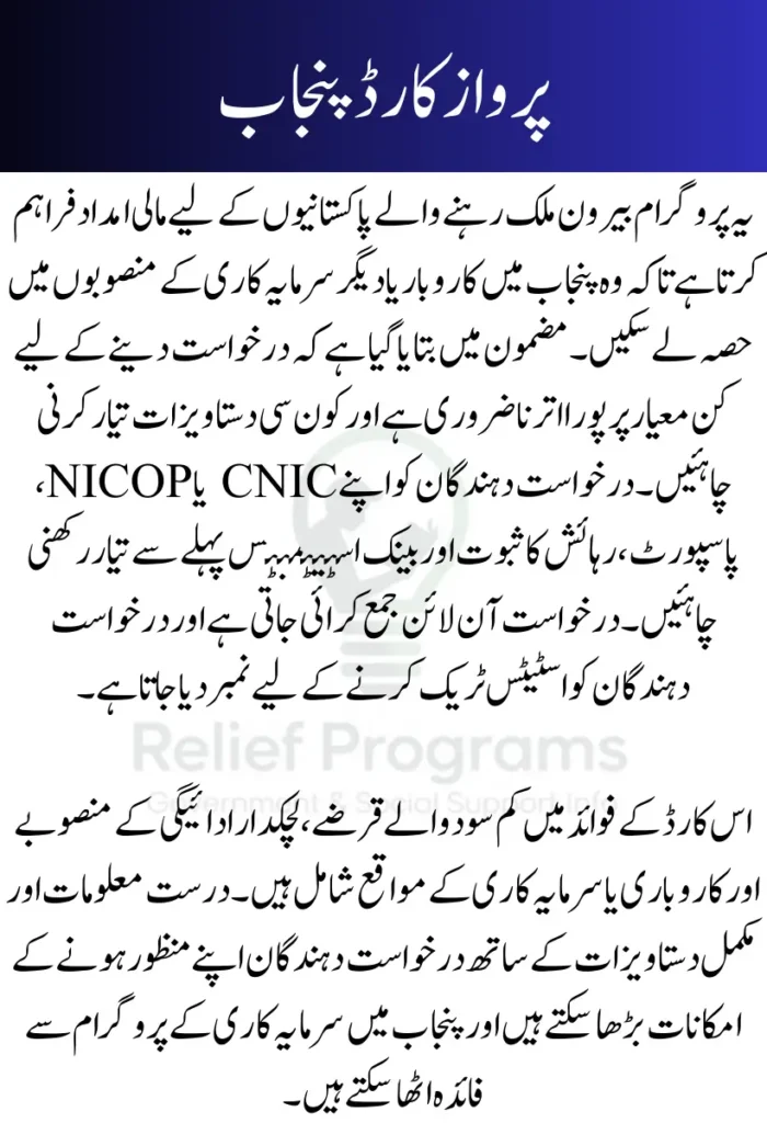 Parwaz Card Punjab 2026 is a government initiative designed to provide financial support to overseas Pakistanis through low-interest loans. This program aims to encourage investment, business growth, and economic participation by Pakistanis living abroad.