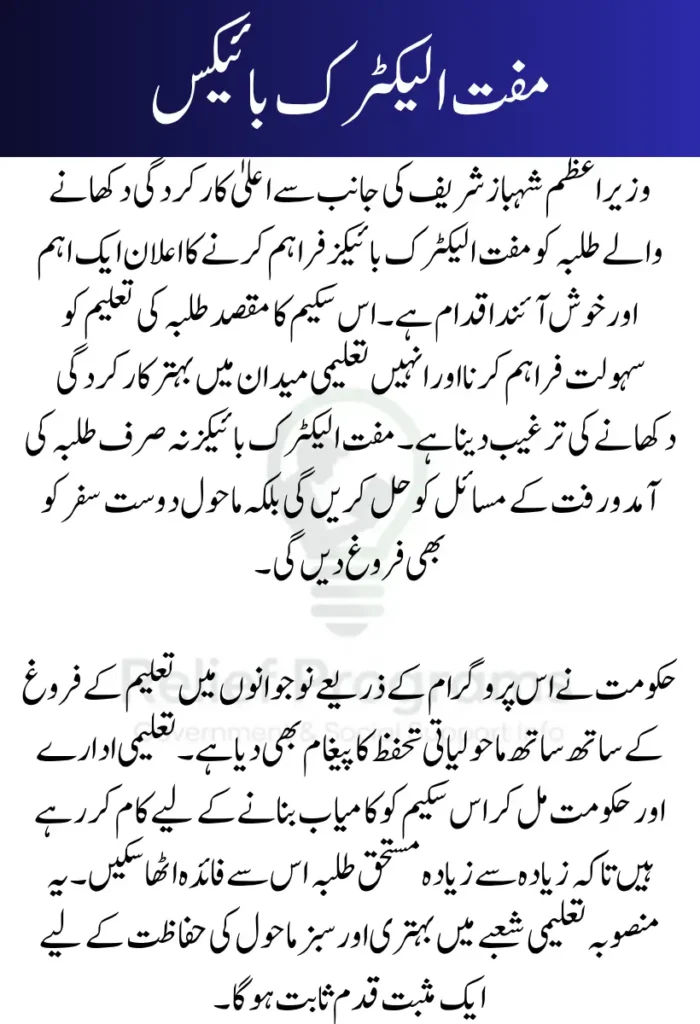 وزیراعظم شہباز شریف نے تعلیمی کارکردگی دکھانے والے طلبہ کو مفت الیکٹرک بائیکز فراہم کرنے کا پروگرام شروع کیا ہے۔ اس اسکیم کا مقصد طلبہ کی آمدورفت کو آسان بنانا اور ماحول دوست سفر کو فروغ دینا ہے۔ مفت الیکٹرک بائیکز کے ذریعے طلبہ آسانی سے اسکول یا کالج پہنچ سکیں گے اور تعلیم میں بہتر کارکردگی دکھانے کی ترغیب ملے گی۔