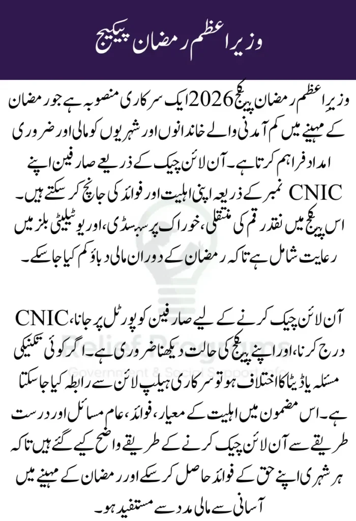 The Prime Minister Ramzan Package 2026 is a government initiative designed to provide financial relief and support to eligible Pakistani citizens during Ramadan. The online check system allows individuals to verify their eligibility and benefit status quickly using their CNIC.