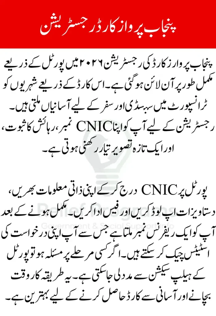 Punjab Parwaz Card Registration through the portal in 2026 is designed to be simple and efficient. By preparing your CNIC, documents, and payment method in advance, you can complete the process quickly and track your application status online. Follow the steps carefully, avoid common mistakes, and keep your reference number safe to receive your card without delay.