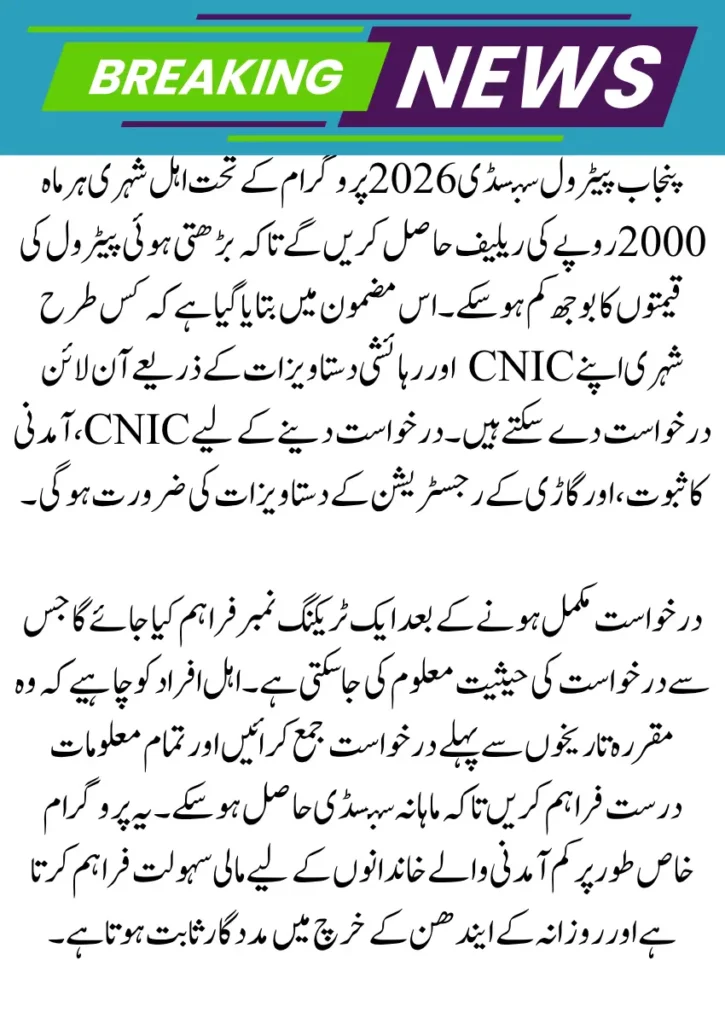 The Punjab Petrol Subsidy 2026 is a provincial initiative providing Rs. 2000 per month to eligible residents to offset rising petrol costs. Designed to support low and middle-income households, the subsidy helps reduce daily fuel expenses for commuting, transportation, and essential travel.